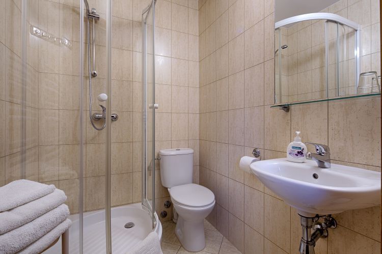 Łazienka z kabiną prysznicową, umywalka, toaleta, ręcznikowiec.