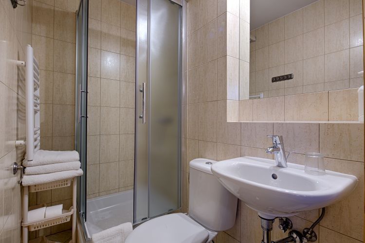 Łazienka z kabiną prysznicową, umywalka, toaleta, ręcznikowiec.