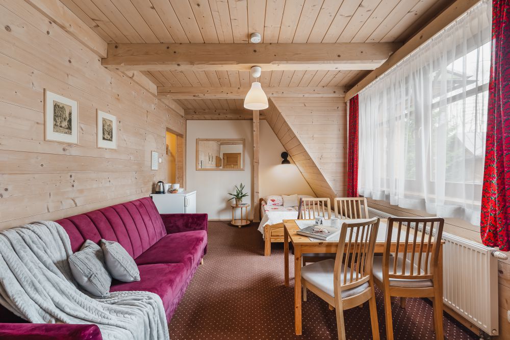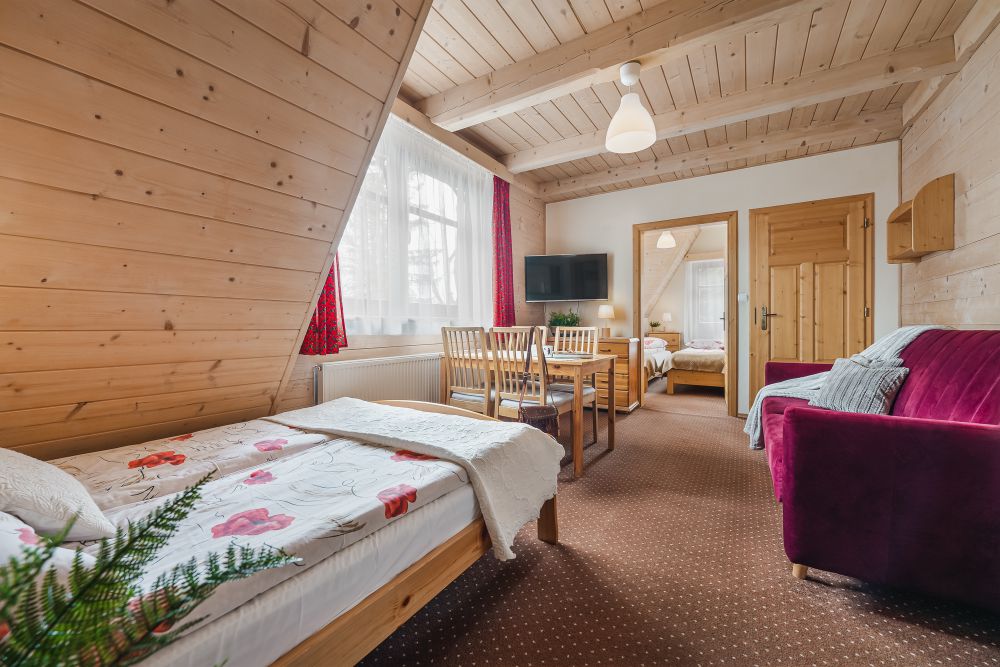 Dwupokojowe studio dla max. 4 osób, kompletnie wyposażone, w stylu regionalnym . Mieści się w Willi Bystry, zlokalizowanej w dzielnicy Zakopanego Bystre, w odległości ok. 1800m od górnej części ulicy Krupówki. Architektura budynku swoim charakterem nawiązuje do stylu zakopiańskiego i jednocześnie w nowoczesny sposób łączy elementy drewna, kamienia i stali. W skład pokoju wchodzi: sypialnia z dwoma łóżkami pojedynczymi, z możliwością ich łączenia, drugi pokój z łóżkiem pojedynczym i rozkładaną kanapą.