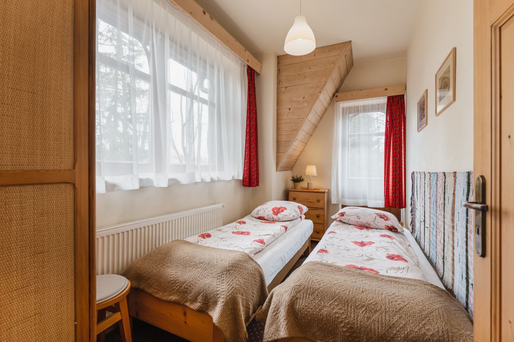 Sypialnia z dwoma łóżkami pojedynczymi, z możliwością łączenia, 2 x szafka nocna, balkon.